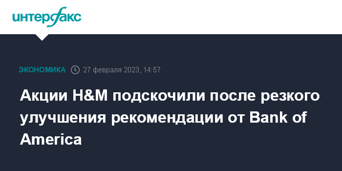 Москва. 27 февраля. INTERFAX.RU - Аналитики Bank of America повысили рекомендацию для акций шведского ритейлера одежды Hennes & Mauritz AB (H&M) сразу на две ступени - до "покупать" с "ниже рынка" и увеличили целевую цену до 165 шведских крон с 90 крон, пишет MarketWatch.