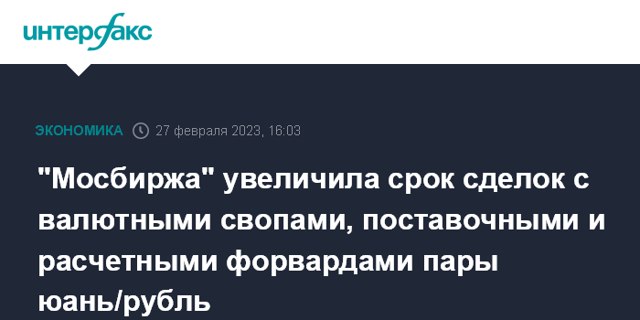 Москва. 27 февраля. INTERFAX.RU - Московская биржа с 27 февраля увеличила максимально возможный срок заключаемых участниками торгов на рынке стандартизированных производных финансовых инструментов (СПФИ) сделок с валютными свопами (FX Swap), а также поставочными и расчетными валютными форвардами (FX Fwd, FX NDF) с валютной парой китайский юань/российский рубль.
