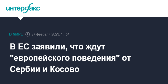 Москва. 27 февраля. INTERFAX.RU - В Евросоюзе ожидают от проходящего в понедельник диалога высокого уровня по нормализации отношений Сербии и Косово "европейского поведения" сторон, чтобы можно было достичь прогресса, заявил Петер Стано, официальный представитель главы дипломатии ЕС Жозепа Борреля.