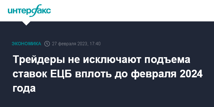 Москва. 27 февраля. INTERFAX.RU - Трейдеры корректируют ожидания в отношении пикового уровня ключевых процентных ставок Европейского центрального банка на фоне сигналов сохранения высокой инфляции.