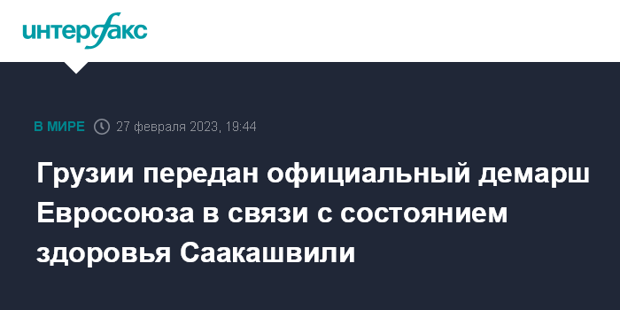 Москва. 27 февраля. INTERFAX.RU - Глава представительства ЕС в Тбилиси Павел Херчинский в понедельник передал министру юстиции Грузии Рати Брегадзе официальный демарш Евросоюза в связи с состоянием здоровья находящегося в заключении экс-президента Грузии Михаила Саакашвили.