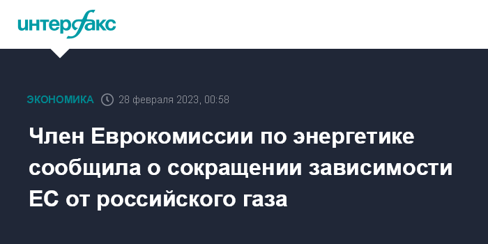 "Цифры говорят сами за себя. Россия больше не является первым поставщиком газа в Европу, ее место заняли США и Норвегия. За 12 месяцев поставки российского трубопроводного газа сократились со 155 млрд кубометров до 62 млрд кубометров. Наш импорт СПГ, напротив, увеличился с 80 млрд кубометров в 2021 году до 135 млрд кубометров в 2022 году", - заявила еврокомиссар в понедельник журналистам в Стокгольме, где 27-28 февраля проходит неформальный Совет ЕС по вопросам телекоммуникаций, транспорта и энергетики.
