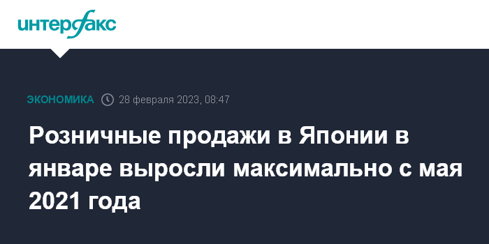 Москва. 28 февраля. INTERFAX.RU - Розничные продажи в Японии в январе увеличились по итогам 11-го месяца подряд, причем темпы их роста были максимальными с мая 2021 года.