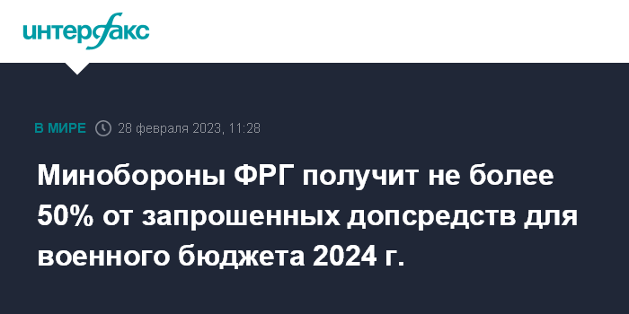 Москва. 28 февраля. INTERFAX.RU - Министерство финансов Германии в рамках наращивания военных расходов страны согласно выделить дополнительно 3-5 млрд евро для оборонного бюджета 2024 года - максимум половину от суммы в 10 млрд евро, запрашиваемой главой Минобороны Борисом Писториусом, передает Bloomberg со ссылкой на источники.