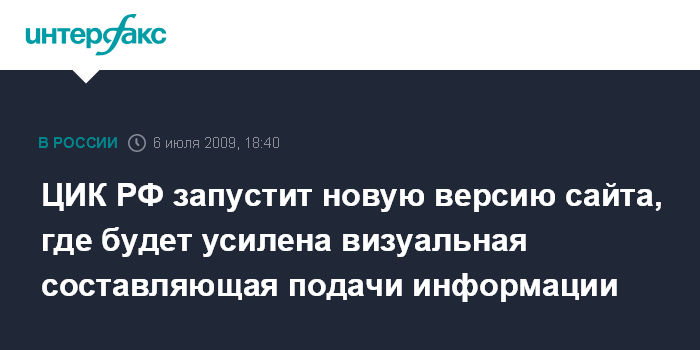 Москва. 6 июля. INTERFAX.RU - ЦИК России во вторник представит новую версию своего Интернет-сайта с повышенным уровнем оперативности информирования о российской избирательной системе, сообщили в пресс-службе ведомства.