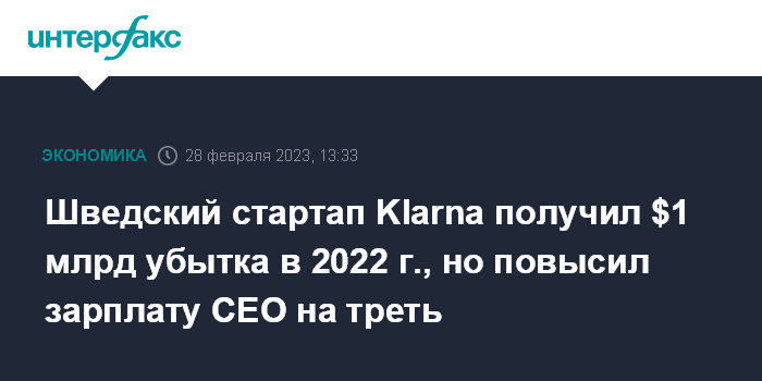 Москва. 28 февраля. INTERFAX.RU - Шведский сервис онлайн-платежей Klarna увеличил чистый убыток в полтора раза в 2022 году, до 10,4 млрд шведских крон ($1 млрд), однако это не помешало компании повысить размер вознаграждения своему главному исполнительному директору, пишет Financial Times.