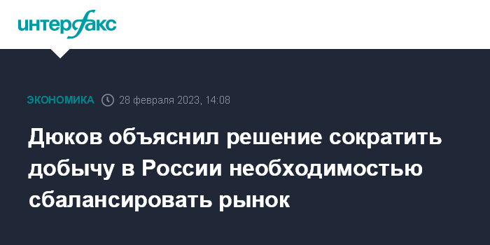 Москва. 28 февраля. INTERFAX.RU - Решение правительства России сократить добычу нефти в марте позволит сбалансировать ситуацию на мировом рынке, считает глава "Газпром нефти" Александр Дюков.