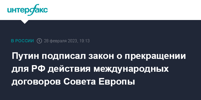 Москва. 28 февраля. INTERFAX.RU - Президент РФ Владимир Путин подписал закон, который прекращает действие в отношении России международных договоров Совета Европы.