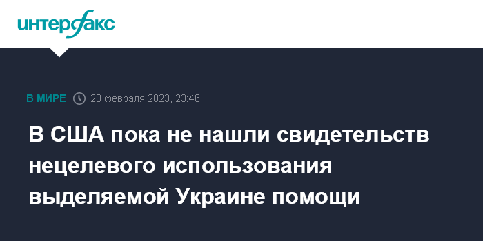 Москва. 28 февраля. INTERFAX.RU - Генеральный инспектор министерства обороны США Роберт Сторч заявил, что его ведомство пока не выявило случаи нецелевого использования американской помощи Украине, сообщает во вторник Associated Press.