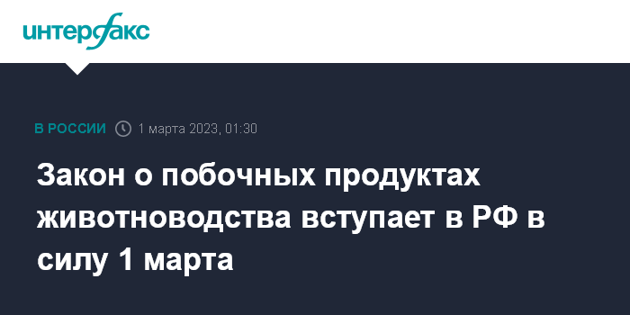 Москва. 1 марта. INTERFAX.RU - Закон "О побочных продуктах животноводства и о внесении изменений в отдельные законодательные акты Российской Федерации" вступает в силу в РФ с 1 марта.