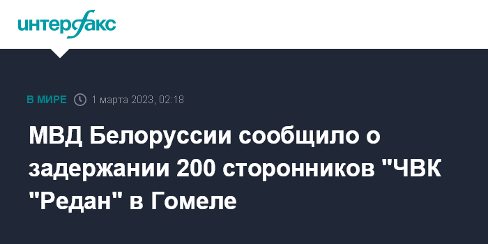 Москва. 1 марта. INTERFAX.RU - Накануне в Гомеле задержали 200 сторонников "ЧВК" "Редан", сообщило Министерство внутренних дел Белоруссии.