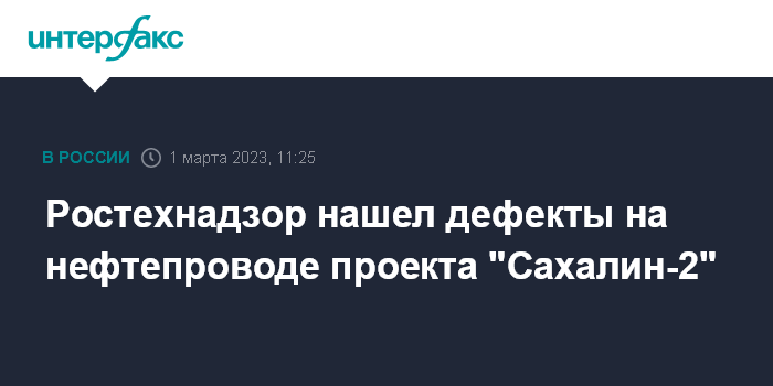 Москва. 1 марта. INTERFAX.RU - Внутритрубная диагностика нефтепровода проекта "Сахалин-2" выявила дефекты, сообщил Ростехнадзор, не уточняя критичность этих дефектов.