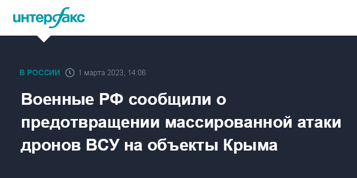 Москва. 1 марта. INTERFAX.RU - Российские военные предотвратили попытку массированной атаки украинских беспилотников на объекты Крымского полуострова, заявил официальный представитель Минобороны РФ Игорь Конашенков.
