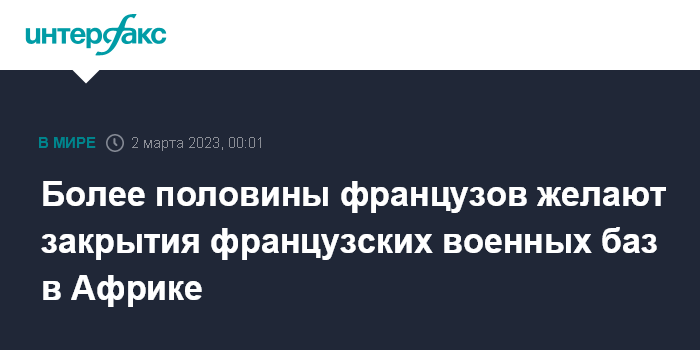 Москва. 2 марта. INTERFAX.RU - Франции следует закрыть все свои военные базы в Африке, считают 55% участников социологического опроса, проведенного институтом общественного мнения IFOP по заказу Le Journal du dimanche.