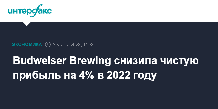 Москва. 2 марта. INTERFAX.RU - Пивоваренная компания Budweiser Brewing Co. APAC Ltd. в 2022 году сократила чистую прибыль на 4% - до $913 млн по сравнению с $930 млн годом ранее.