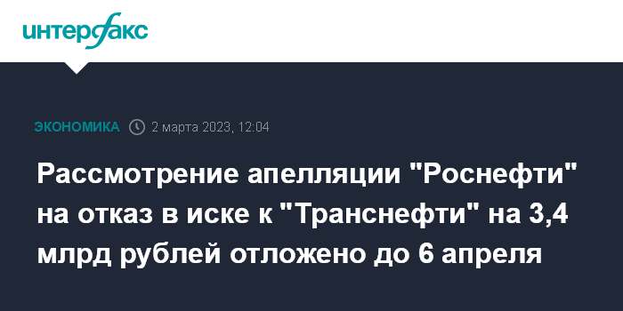 Москва. 2 марта. INTERFAX.RU - Девятый арбитражный суд отложил на 6 апреля рассмотрение апелляционной жалобы "Роснефти" на решение об отказе в удовлетворении иска к "Транснефти" на 3,4 млрд рублей, следует из картотеки суда. Предполагалось, что апелляция будет рассмотрена 2 марта.
