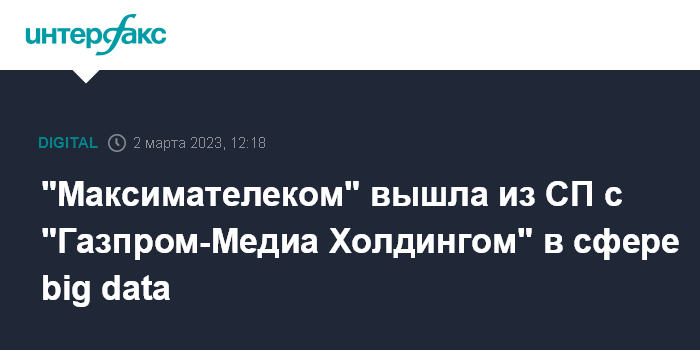 Москва. 2 марта. INTERFAX.RU -"Максимателеком" вышла из совместного предприятия с "Газпром-Медиа Холдингом" в сфере big data - ООО "ГПМ Дата", следует из данных аналитической системы "СПАРК-Интерфакс".