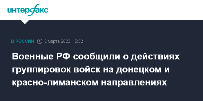 Москва. 2 марта. INTERFAX.RU - Группировки российских войск "Юг" и "Центр" ведут активные действия на донецком и красно-лиманском направлениях, заявил официальный представитель Минобороны РФ Игорь Конашенков.