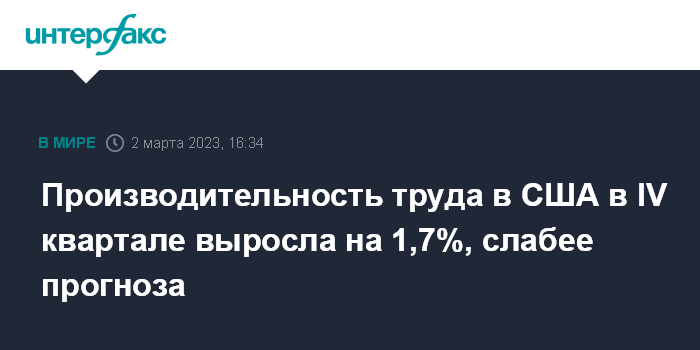 Москва. 2 марта. INTERFAX.RU - Производительность труда в США в четвертом квартале увеличилась на 1,7%, свидетельствуют окончательные данные министерства труда страны.