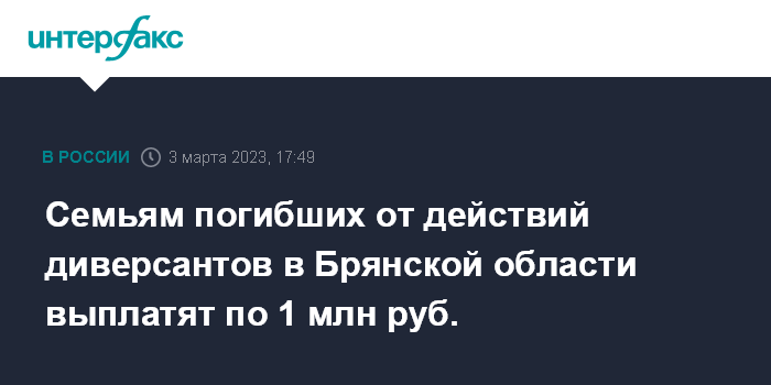 Семьям погибших от действий диверсантов в Брянской области выплатят по 1 млн руб.