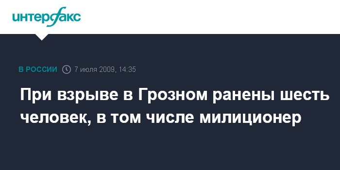 Москва. 7 июля. INTERFAX.RU - В результате взрыва в Грозном, по предварительным данным, пострадали шесть человек, сообщили "Интерфаксу" во вторник в пресс-службе МВД Чеченской Республики. Один из пострадавших, по данным МВД, - сотрудник милиции, которой в момент взрыва находился на посту.