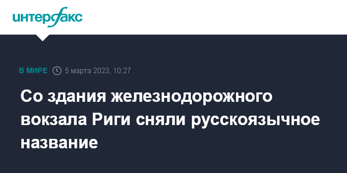 Москва. 5 марта. INTERFAX.RU - Со здания Центрального железнодорожного вокзала в Риге демонтировано название на русском языке - слово "вокзал", заявили в Министерстве сообщения.
