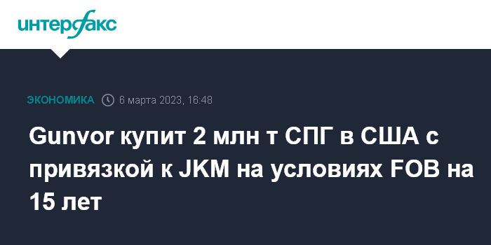 Москва. 6 марта. INTERFAX.RU - Швейцарский сырьевой трейдер Gunvor заключил соглашение с американской добывающей компанией Chesapeake Energy Corporation об условиях поставки до 2 млн тонн сжиженного природного газа (СПГ) с привязкой к индексу цен на азиатском рынке (Japan Korea Marker, JKM) сроком на 15 лет.
