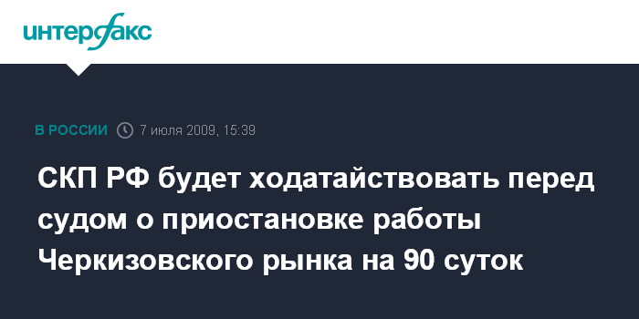 Москва. 7 июля. INTERFAX.RU - Следственный комитет при прокуратуре РФ направил в суд административные дела о приостановлении деятельности пяти предприятий, расположенных на территории Черкизовского рынка Москвы, сообщил "Интерфаксу" во вторник официальный представитель СКП РФ Владимир Маркин. Кроме того, отметил он, "планируется, что в результате проводимых мероприятий в суд будут внесены дополнительные представления о приостановлении деятельности рынка в административном порядке на срок 90 суток".
