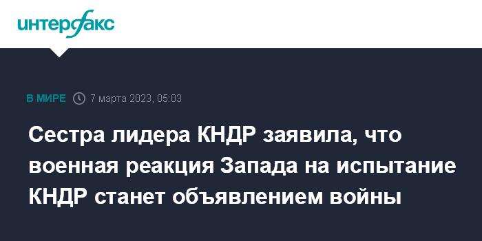 Москва. 7 марта. INTERFAX.RU - Сестра северокорейского лидера и заместитель заведующего ЦК ТПК Ким Е Чжон предупредила, что КНДР будет расценивать как объявление войны любую военную попытку США и Южной Кореи помешать ракетным испытаниям Пхеньяна.