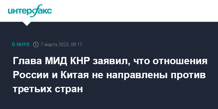 "Китайско-российские отношения основаны на принципах неприсоединения, они не направлены против третьих стран и не создают угрозы для третьих стран", - сказал китайский министр иностранных дел.
