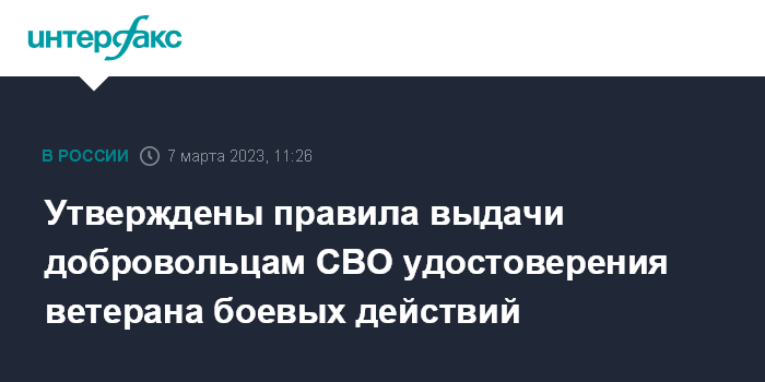Москва. 7 марта. INTERFAX.RU - Правительство утвердило правила выдачи добровольцам удостоверения ветерана боевых действий, такое постановление опубликовано на официальном портале правовой информации.