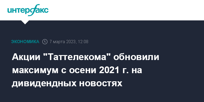 Москва. 7 марта. INTERFAX.RU - Акции ПАО "Таттелеком" днем во вторник подскочили более чем на 7% и обновили максимум с осени 2021 года после известий о рекомендациях по дивидендам за 2022 год.