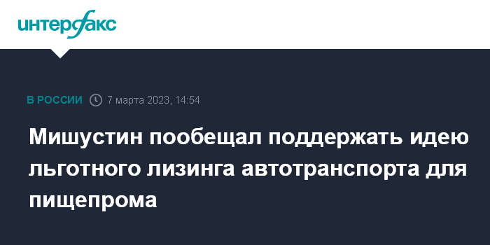 Москва. 7 марта. INTERFAX.RU - Премьер-министр РФ Михаил Мишустин поддержал предложение о распространении программы льготного лизинга автотранспорта для нужд пищевой промышленности.