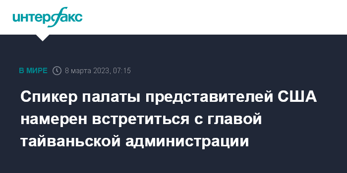 Москва. 8 марта. INTERFAX.RU - Спикер палаты представителей американского конгресса Кевин Маккарти подтвердил, что в нынешнем году планирует встретиться с главой администрации Тайваня Цай Инвэнь, сообщило агентство Bloomberg.