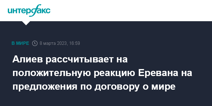 Москва. 8 марта. INTERFAX.RU - В Баку надеются, что Ереван положительно отреагирует на предложения Азербайджана по мирному соглашению между двумя странами, заявил президент Азербайджана Ильхам Алиев.