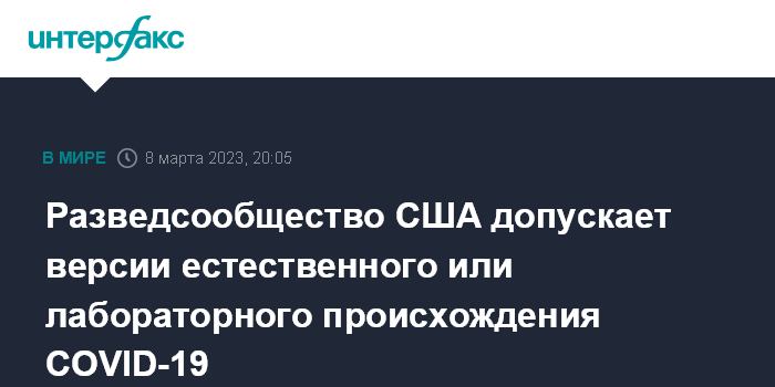 Москва. 8 марта. INTERFAX.RU - Американские спецслужбы считают возможным, что коронавирус COVID-19 мог появиться естественным образом или в результате инцидента в лаборатории, говорится в ежегодном отчете разведывательного сообщества США по оценке угроз стране.