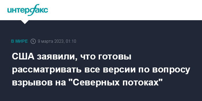 Москва. 9 марта. INTERFAX.RU - США в вопросе взрывов на "Северных потоках" ждут завершения расследований и готовы рассматривать все возможные версии, заявил в среду представитель госдепа Нед Прайс.