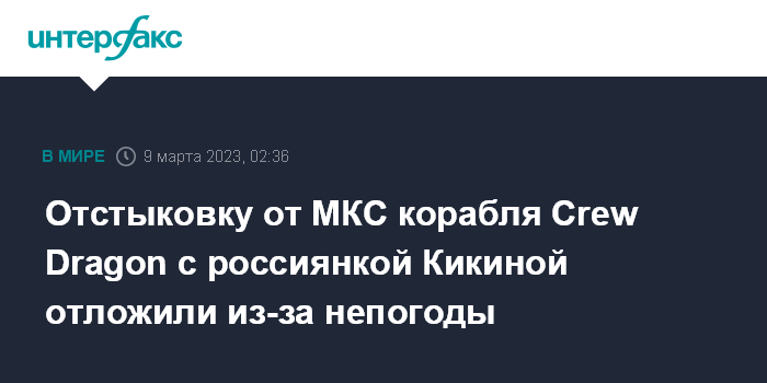 Москва. 9 марта. INTERFAX.RU - Отстыковка корабля Crew Dragon компании SpaceX с космонавтом "Роскосмоса" Анной Кикиной в составе экипажа от Международной космической станции (МКС) для возвращения на Землю, которую планировали осуществить 9 марта, откладывается из-за прогнозируемого сильного ветра в районе приводнения, сообщило в четверг NASA.
