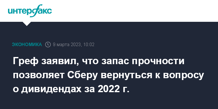 Москва. 9 марта. INTERFAX.RU - Достигнутый запас прочности позволяет Сбербанку вернуться к рассмотрению вопроса о выплате дивидендов по итогам 2022 года, заявил глава кредитной организации Герман Греф.