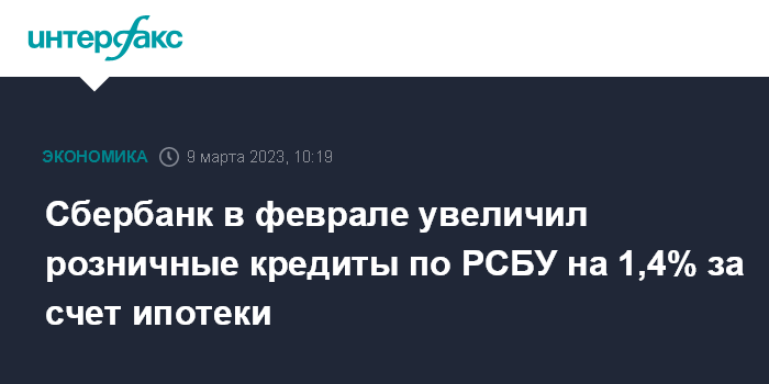 Москва. 9 марта. INTERFAX.RU - Сбербанк в феврале увеличил розничный кредитный портфель по РСБУ на 1,4%, в основном благодаря ипотеке, которая выросла за месяц на 1,8%, говорится в пресс-релизе кредитной организации.