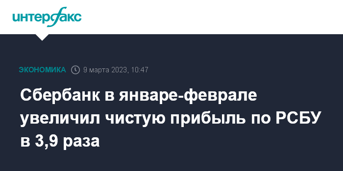 Москва. 9 марта. INTERFAX.RU - Сбербанк в январе-феврале 2023 года увеличил чистую прибыль по РСБУ на 286,5% (в 3,9 раза) - до 225 млрд рублей, говорится в сообщении кредитной организации.