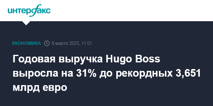Москва. 9 марта. INTERFAX.RU - Германский производитель одежды и аксессуаров Hugo Boss AG в 2022 году зафиксировал рекордный объем выручки в 3,651 млрд евро, что на 31% превзошло показатель предыдущего года. Органический рост составил 27%.