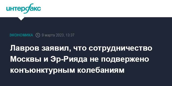 Москва. 9 марта. INTERFAX.RU - Взаимодействие России и Саудовской Аравии в сфере энергетики и во всех остальных сферах не подвержено конъюнктурным колебаниям, заявил глава МИД РФ Сергей Лавров.