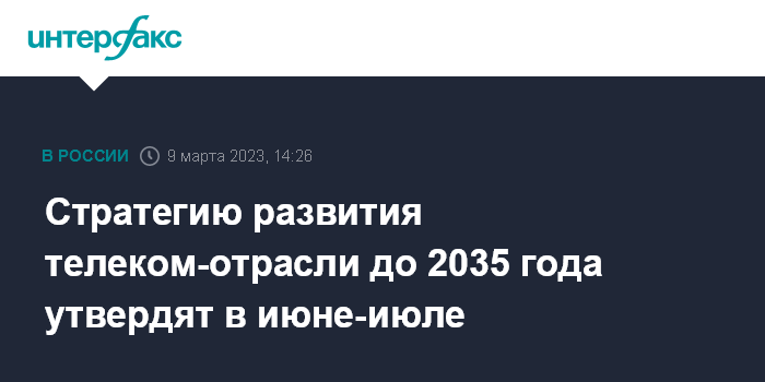 Москва. 9 марта. INTERFAX.RU - Стратегию развития российской телеком-отрасли до 2035 года должны утвердить не позднее июня-июля, сообщила пресс-служба правительства.