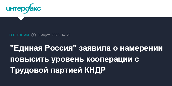 Москва. 9 марта. INTERFAX.RU - Партия "Единая Россия" заявила о нацеленности на повышение уровня и эффективности кооперации с Трудовой партией Северной Кореи.