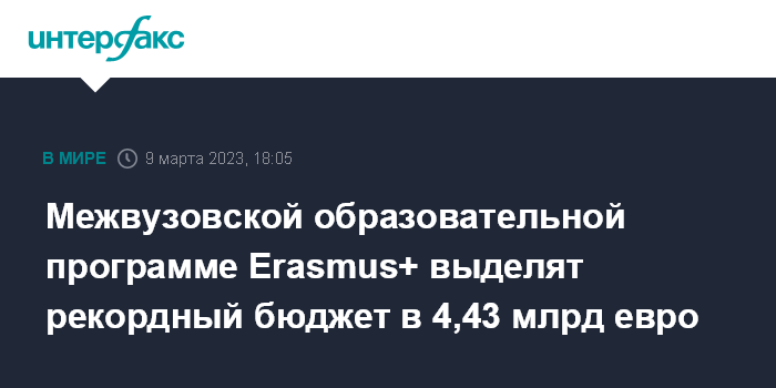 Москва. 9 марта. INTERFAX.RU - Еврокомиссия (ЕК) объявила в четверг об утверждении пересмотренной годовой рабочей программы межвузовского обмена Erasmus+ на 2023 год с выделением на нее рекордной суммы в 4,43 млрд евро.
