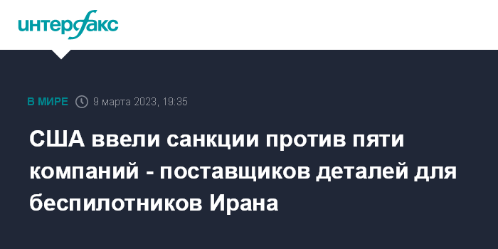 Москва. 9 марта. INTERFAX.RU - Минфин США в четверг объявил о санкциях в отношении пяти компаний, базирующихся в Китае, и одного физического лица в связи с поставками Ирану компонентов, которые можно использовать при производстве беспилотников.