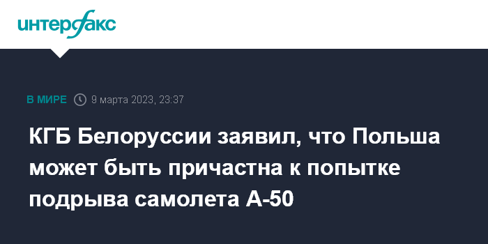 Москва. 9 марта. INTERFAX.RU - К попытке подрыва самолета А-50 на аэродроме в Мачулищах могут быть причастны спецслужбы Польши, заявил анонимный оперативный сотрудник КГБ Беларуси в эфире гостелеканала "Беларусь-1".