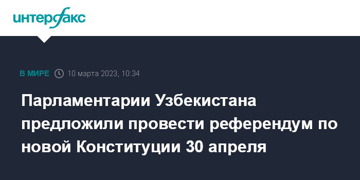 Москва. 10 марта. INTERFAX.RU - Законодательная (нижняя) палата парламента Узбекистана на заседании в пятницу предложила провести референдум по новой Конституции 30 апреля.