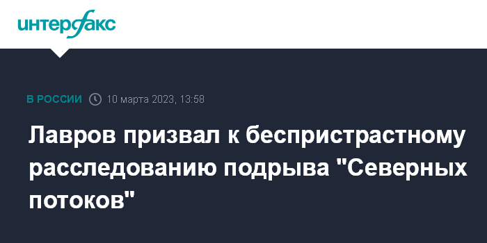 Москва. 10 марта. INTERFAX.RU - Россия выступает за всестороннее прозрачное расследование взрывов газопроводов "Северный поток", в случае отсутствия такого расследования будет думать, как она может ответить Западу, заявил глава МИД РФ.